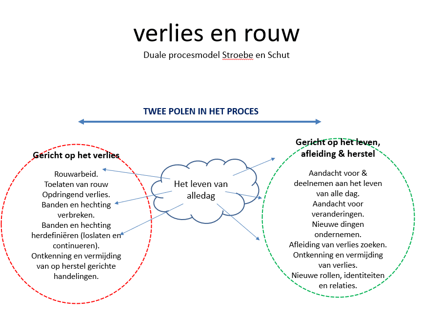 Die aanpak is gebaseerd op het duale procesmodel van Stroebe en Schut. Dit model laat zien dat rouwen in het leven van alledag tussen twee thema’s heen en weer beweegt. Van verdriet, gemis aan de ene kant en de energie en actie van het leven vandaag en morgen anderzijds. Hieronder het model in beeld.