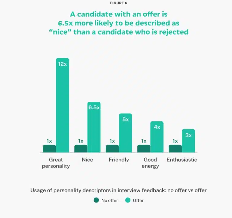 Textio analyseerde de afgelopen jaren 11.000 sollicitatie interviews op de impact van de beoordeling van de sollicitant op niet werkinhoudelijke zaken als ‘een geweldige persoonlijkheid’, ‘aardig persoon’, ‘vriendelijk’ en ‘energiek’. Managers (selecteurs) kiezen graag iemand die ze mogen. Niet zo vreemd natuurlijk want de manager (en de teamgenoten) moeten straks met die persoon gaan werken. Maar: